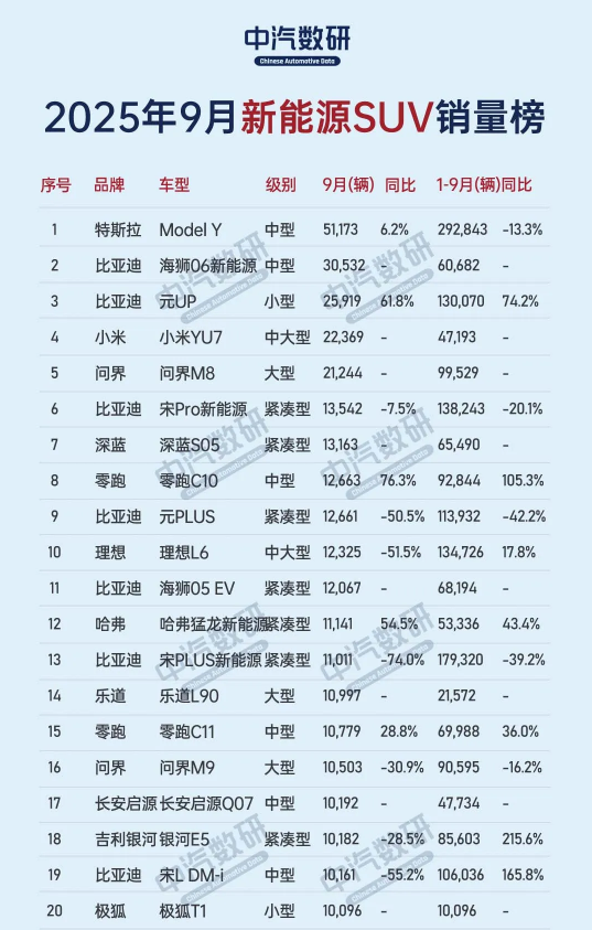 【CNMO科技消息】2025年9月,中国新能源汽车市场持续升温,乘用车零售量达129.6万辆,同比增长15.5%,新能源渗透率达57.8%。其中,新能源SUV销量为63.4万辆,同比增长19.6%。据中汽数研数据,当月共有5款新能源SUV单月销量突破2万辆,市场竞争格局进一步分化。